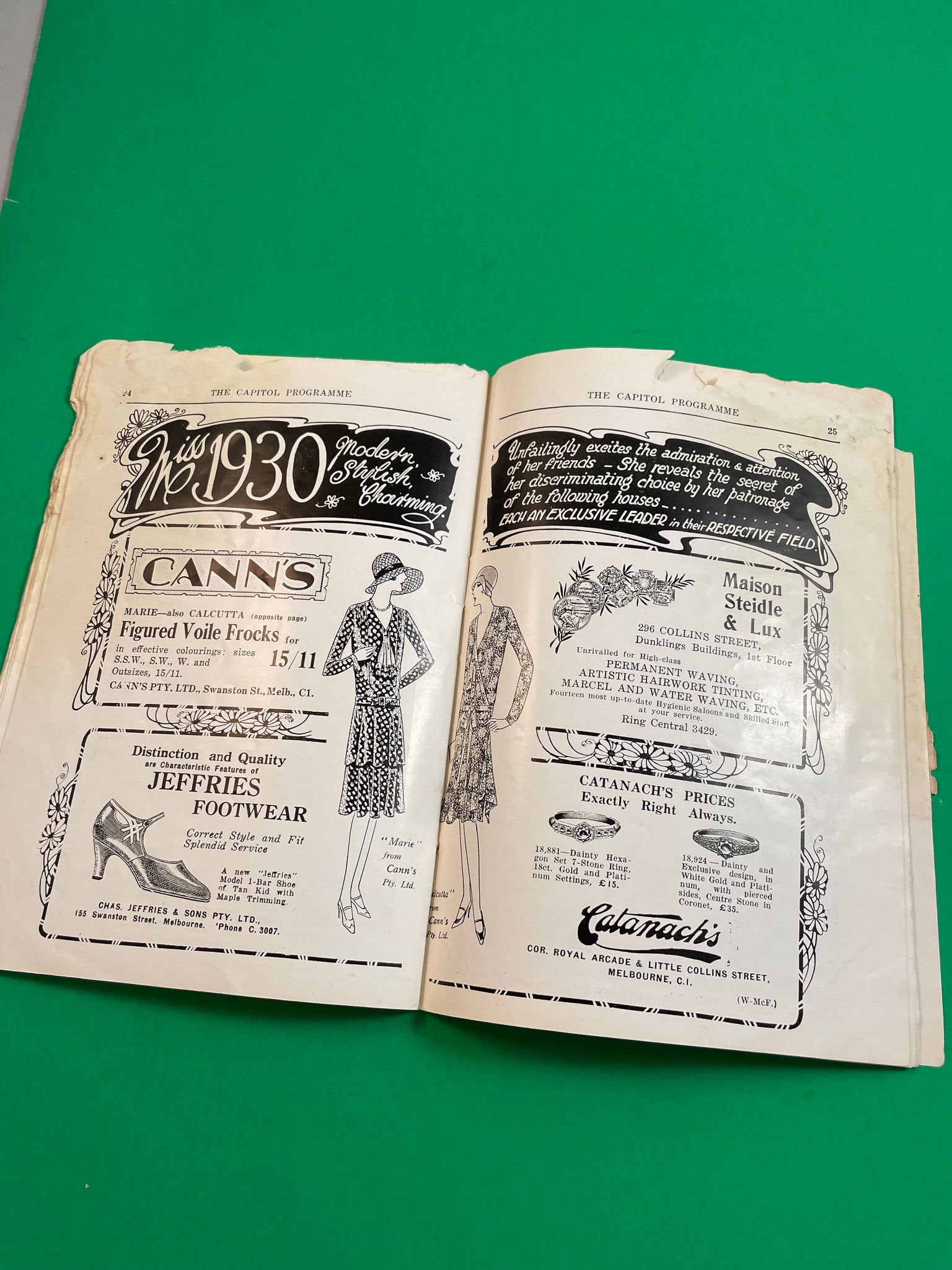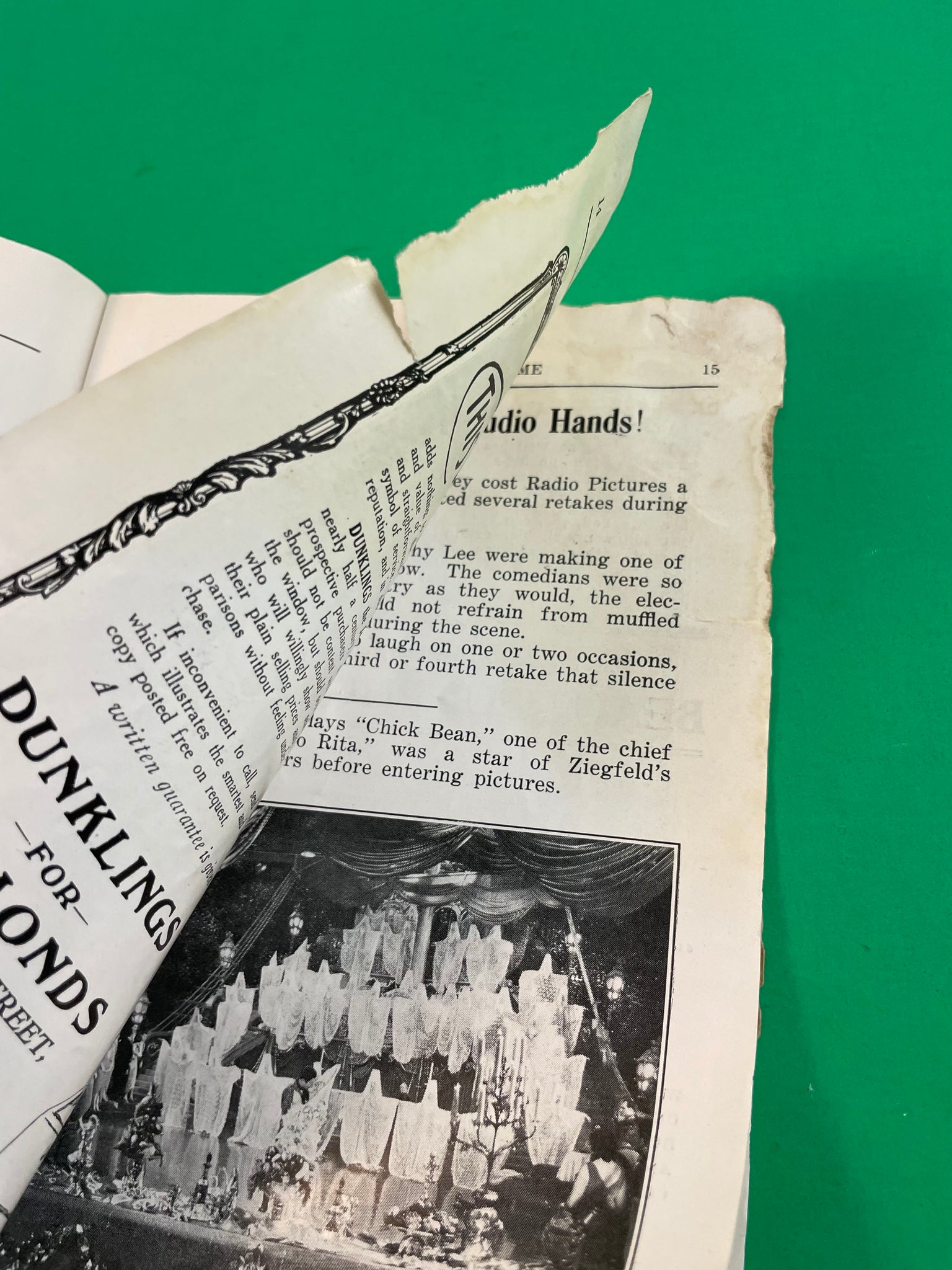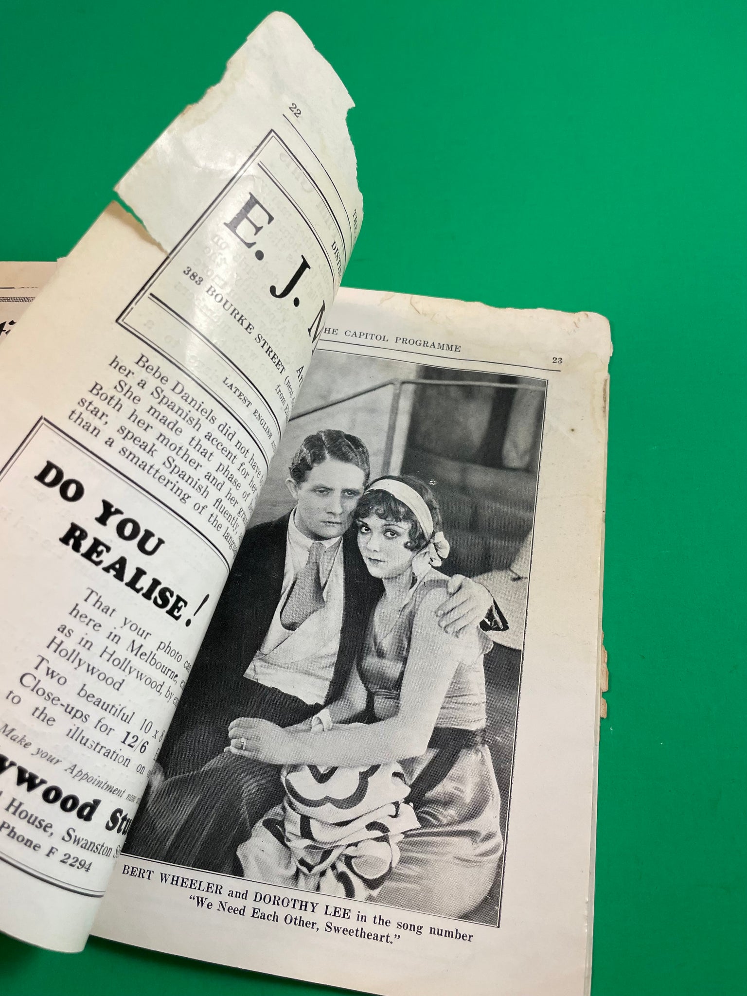 Anything else of note: almost 7.75" x 5.5", chewed up and tears on sides of pages and covers, spine stress, stickers on covers, pencil on first page, dated 1930 based on "Miss 1930" ad inside (although film was released in 1929).